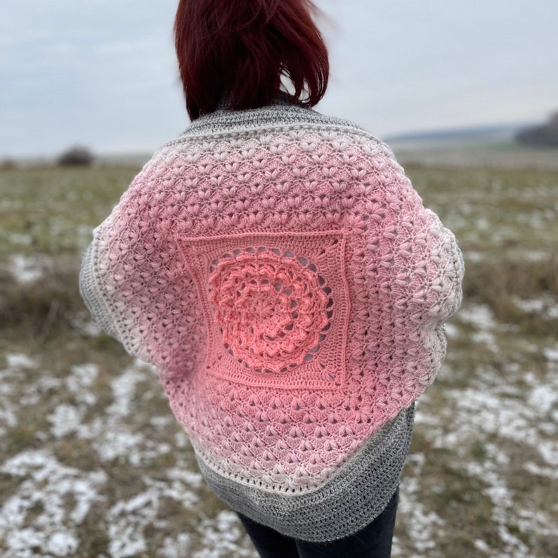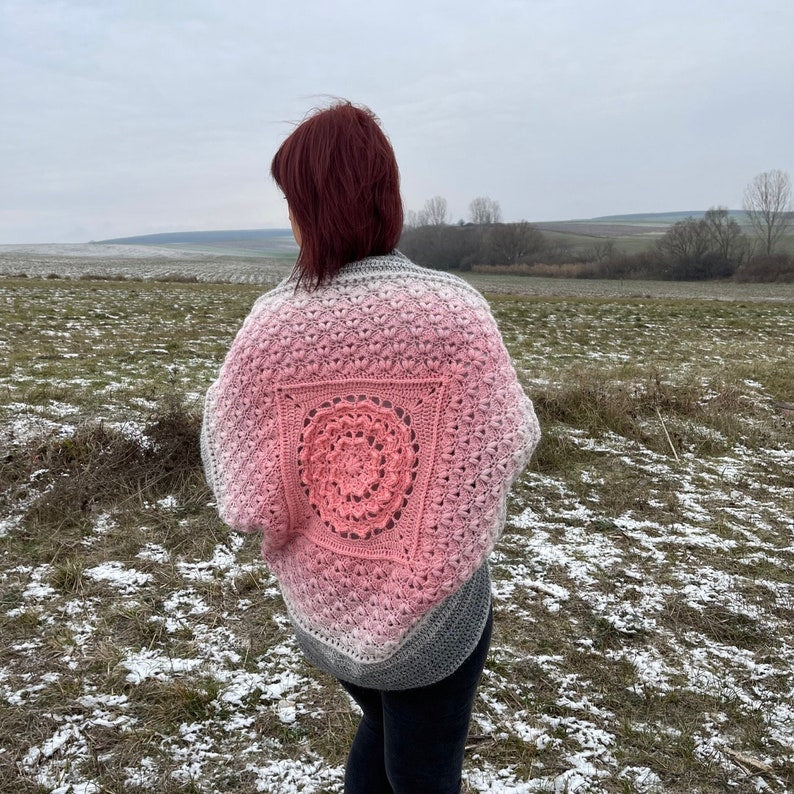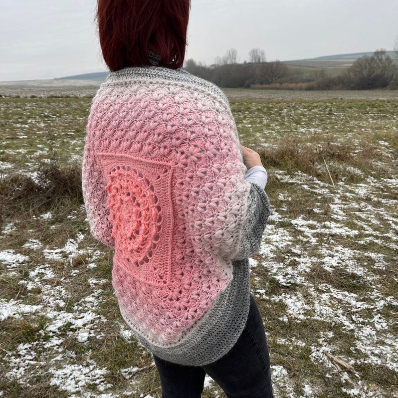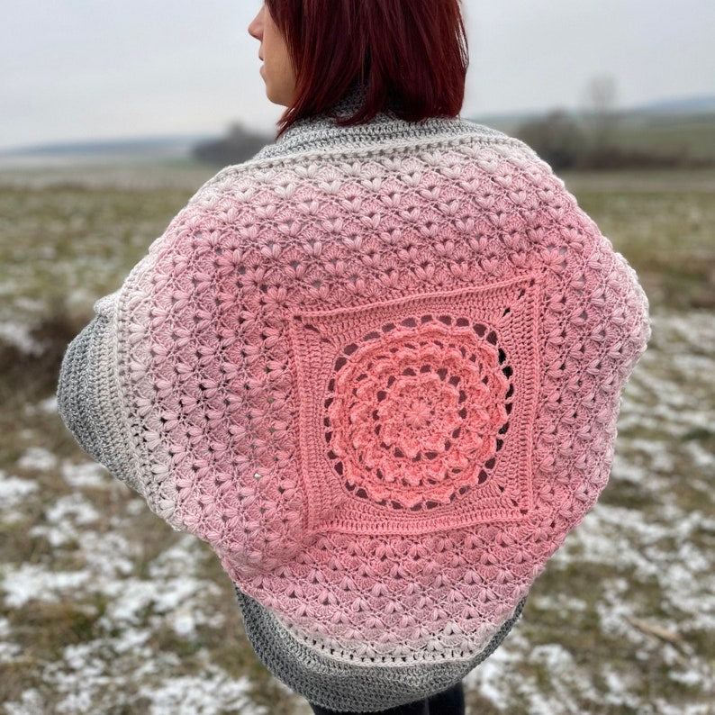 This beautifully textured Floral shrug with the mandala in center is a unique addition to your handmade wardrobe.