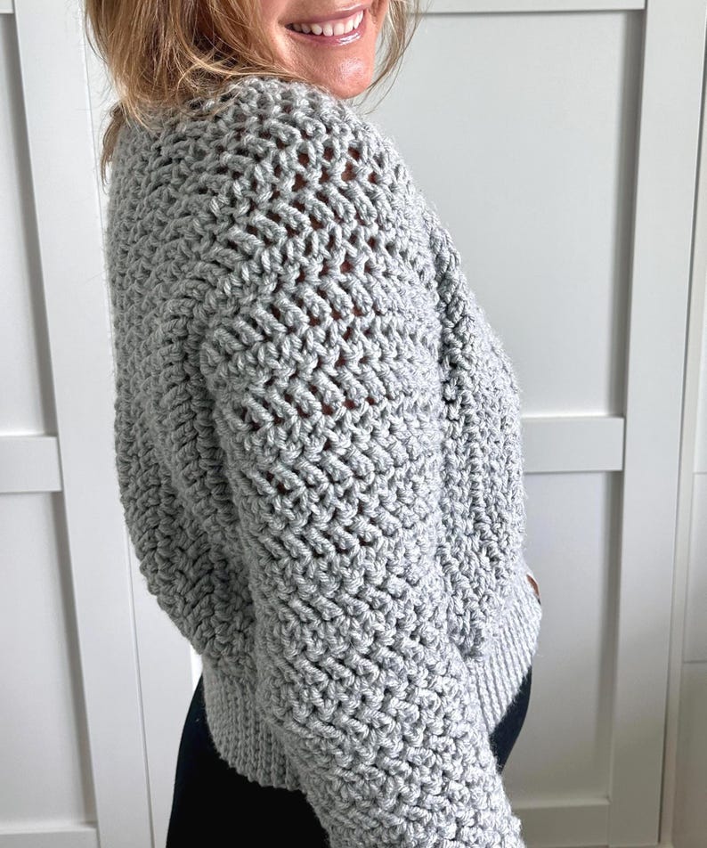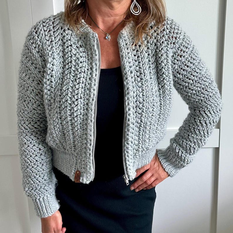 Get stylish with this easy-to-follow zipper crochet cardigan pattern! Perfect for all seasons, this crochet cardigan pattern will add a touch of warmth and elegance to any wardrobe. Designed for comfort and versatility, this easy crochet cardigan pattern and video tutorial guides you through each step to craft a beautifully textured sweater that mimics the bomber jacket. The crochet sweater with its herringbone double crochet stitch forms elegant vertical stripes, while the zipper adds a modern touch. Perfect for layering, this piece will become a staple in your wardrobe. Whether you're making it for yourself or as a thoughtful handmade gift, this women's crochet cardigan pattern is a must-have for any crochet enthusiast. Match it with my Downhill Beanie (sold separately) for a coordinated look.