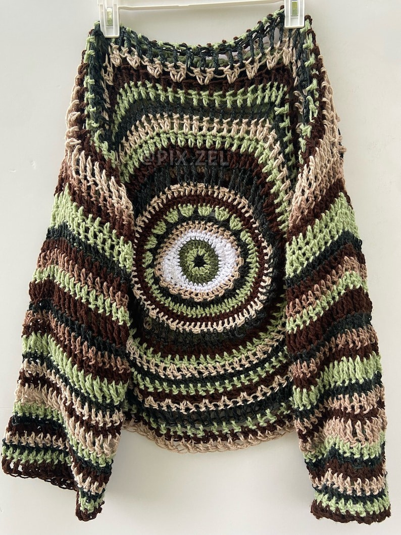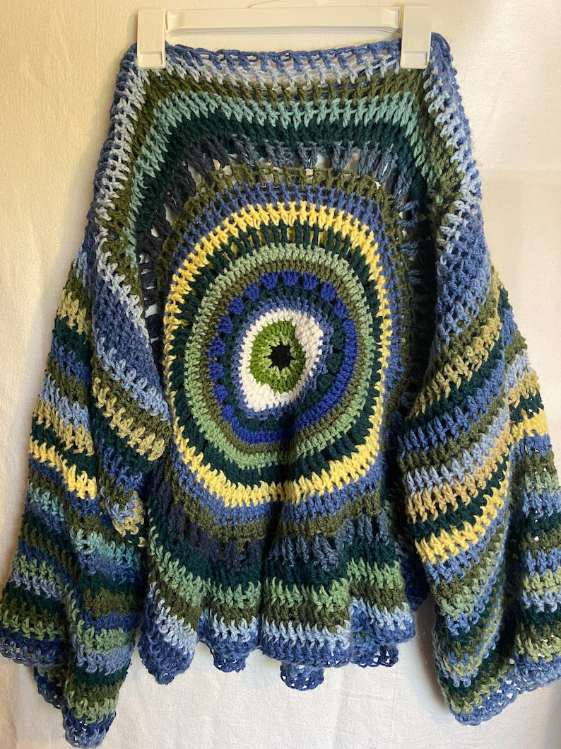 In this tutorial, I will show you how to crochet an eye sweater that can be made into a wall decor, a stool cover, a funky rug, a DIY rug, a crop top, a pillowcase, blanket. Plus size friendly. Advanced tutorial. Written tutorial not the exact same as the Video tutorial please not
